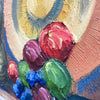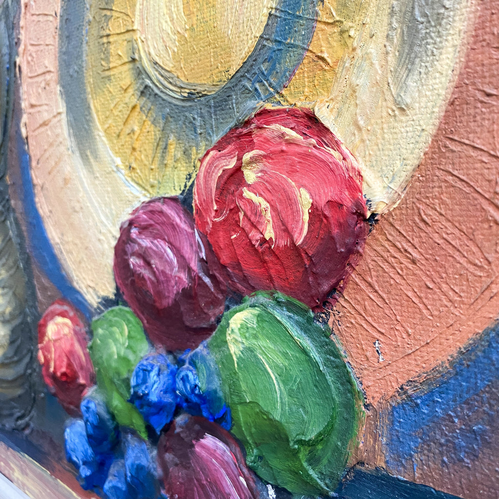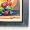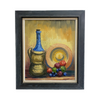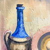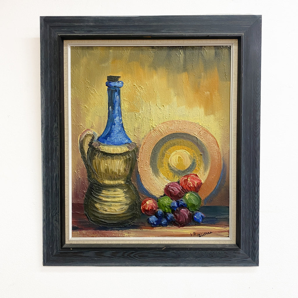 Mid century Danish still life oil painting by R. Ziethen features a tall, blue bottled vessel with an ornate base, a decorative plate with concentric circles, and a rich assortment of grapes and fruit. The warm, golden background contrasts beautifully with the deep blues and earthy tones. Framed in a sleek, dark wood frame.