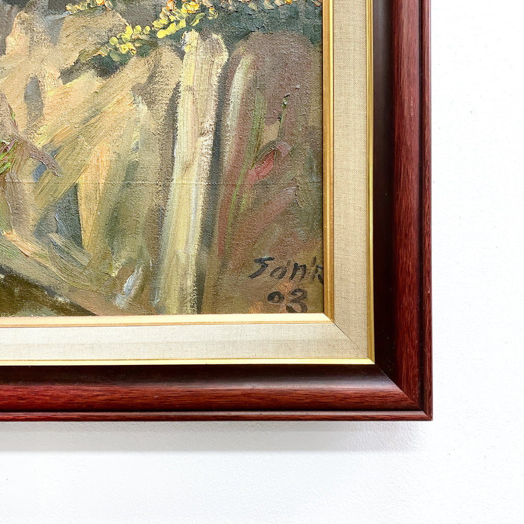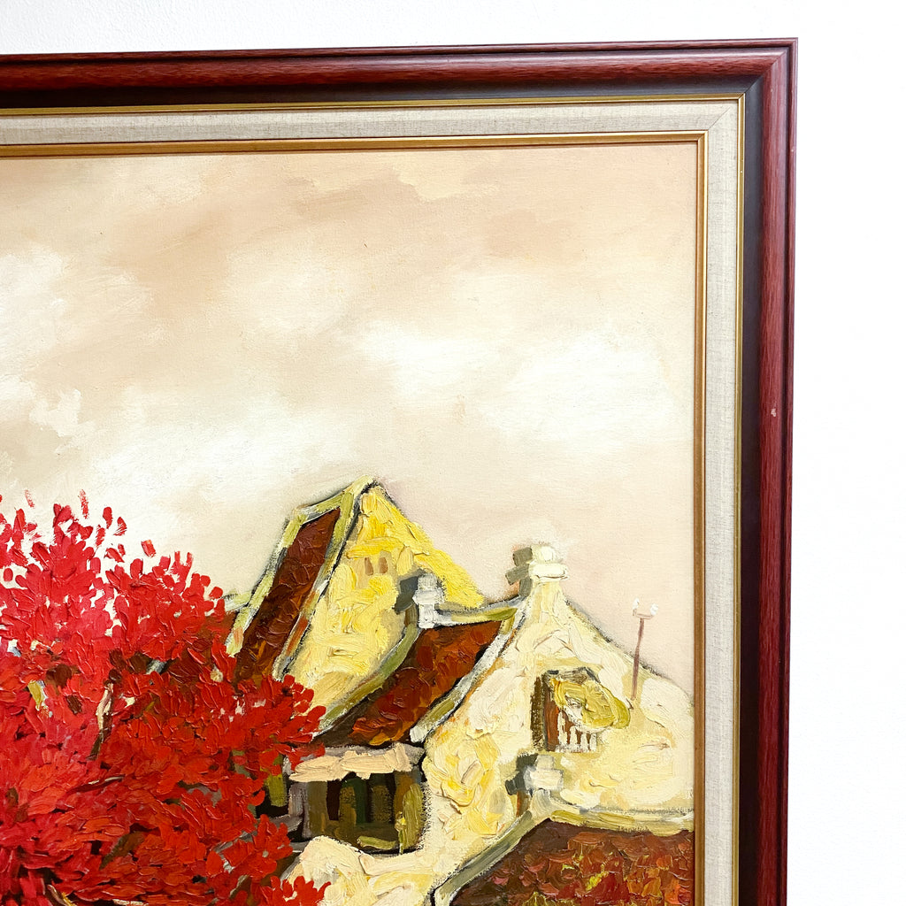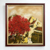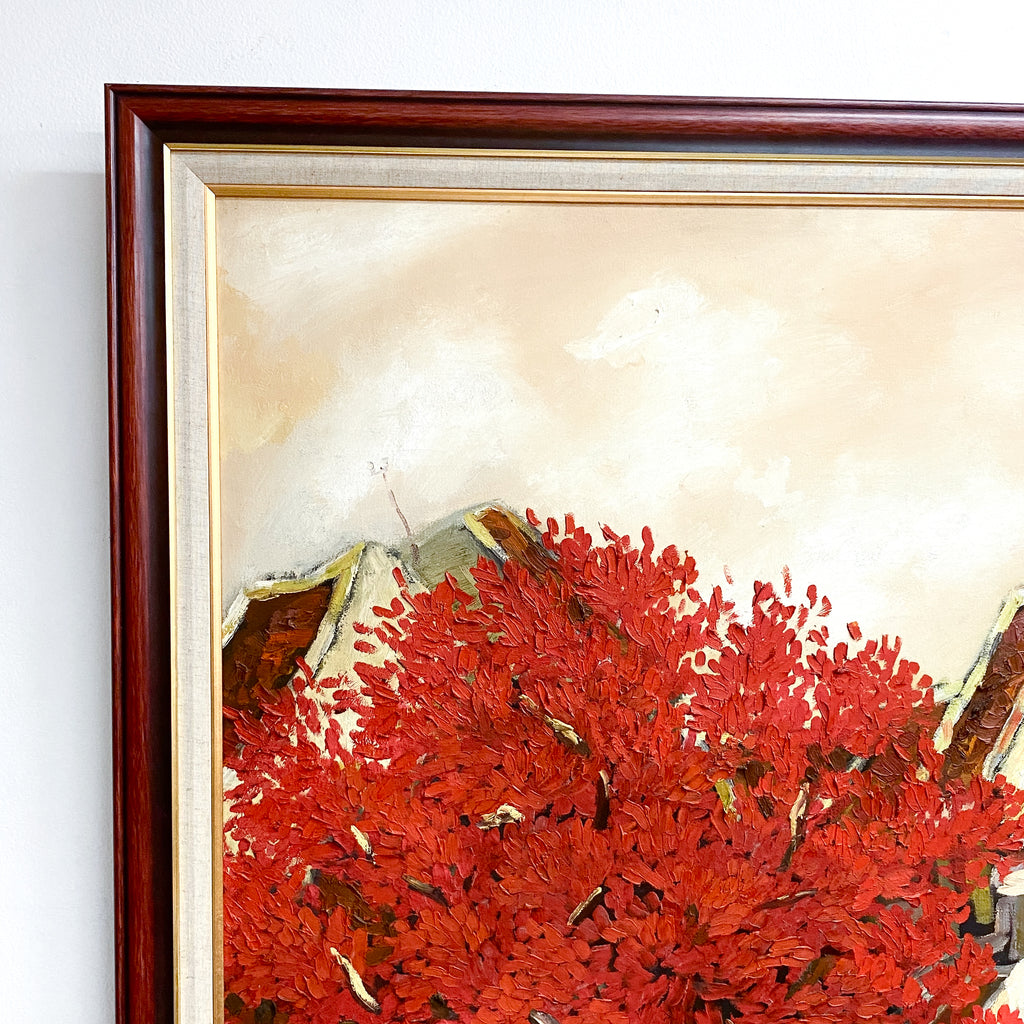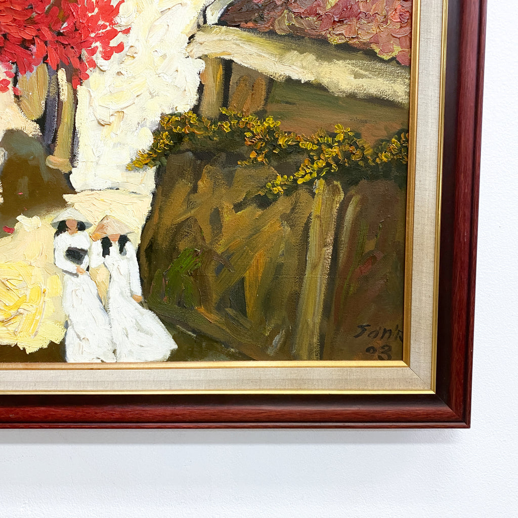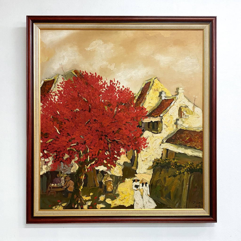 Large textured oil on canvas painting, depicting an Vietnamese urban street scene with a vibrant red flame tree. Signed bottom right corner.