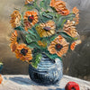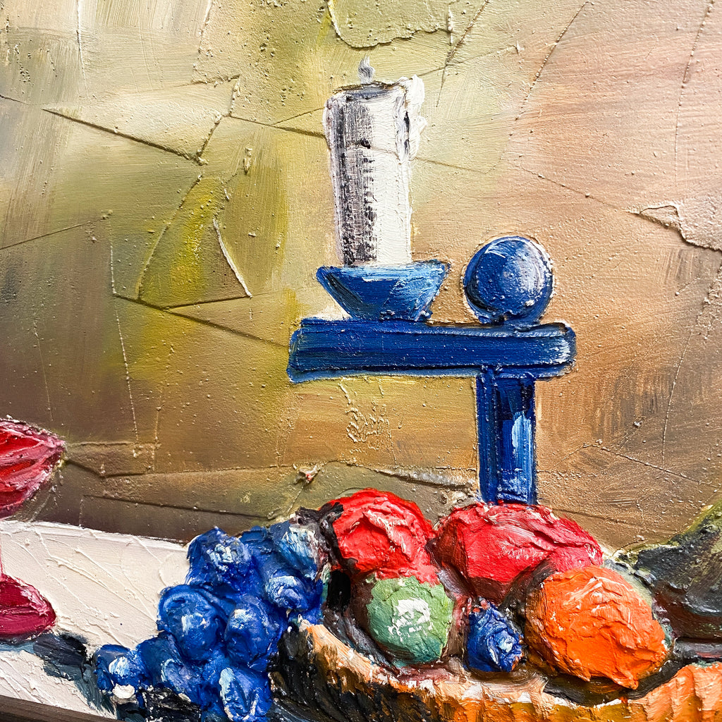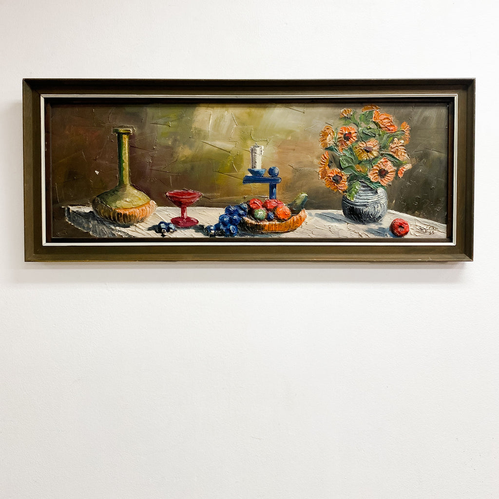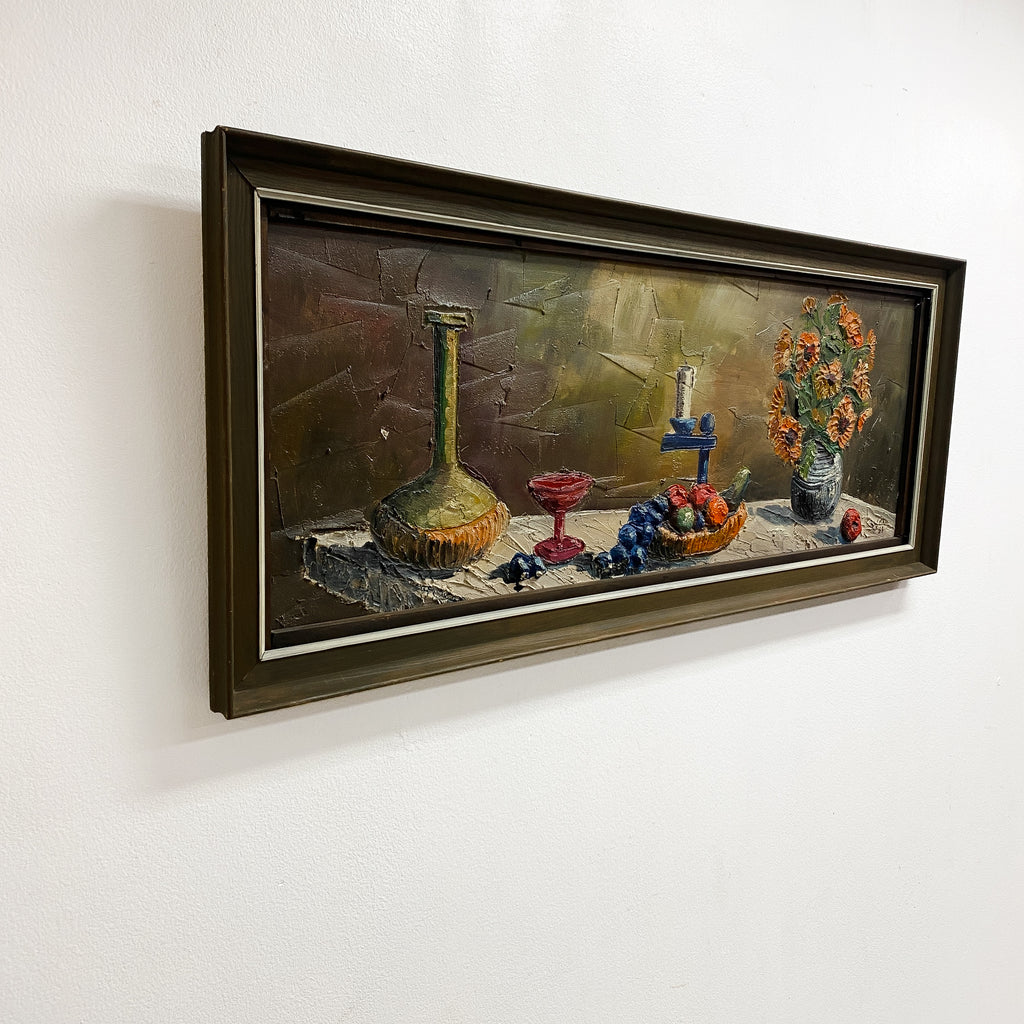 Mid Century oil painting showcases a beautifully textured still life composition, featuring a rustic table adorned with a variety of fruits, a vintage glass bottle, an elegant red goblet and a charming floral arrangement in a ceramic vase. The rich, earthy tones and expressive brushstrokes create depth and warmth, making this artwork a captivating addition to any home.
