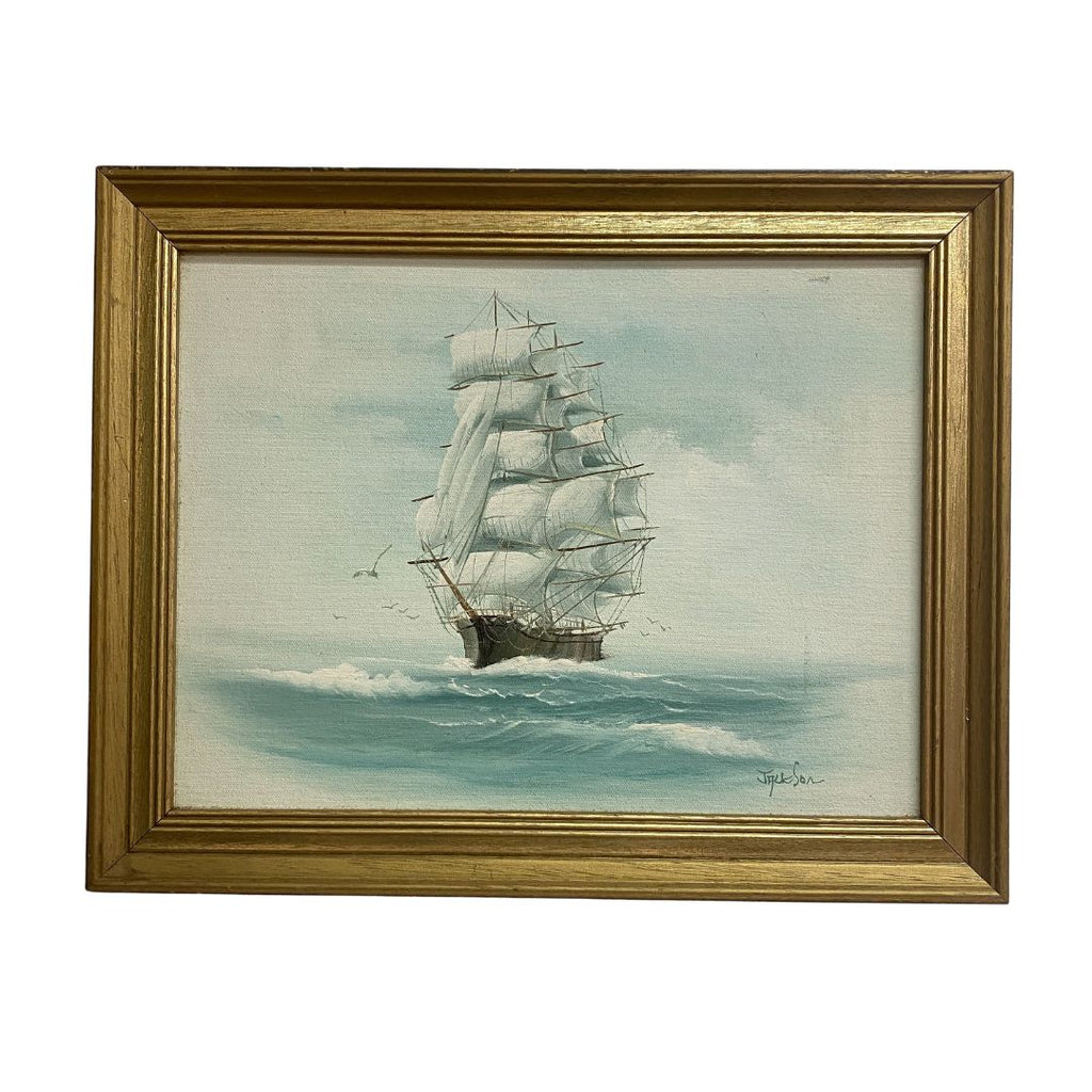 Classic mid century painting of tall ship sailing in the ocean, with gold frame. Signed Jackson.
