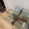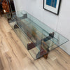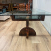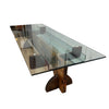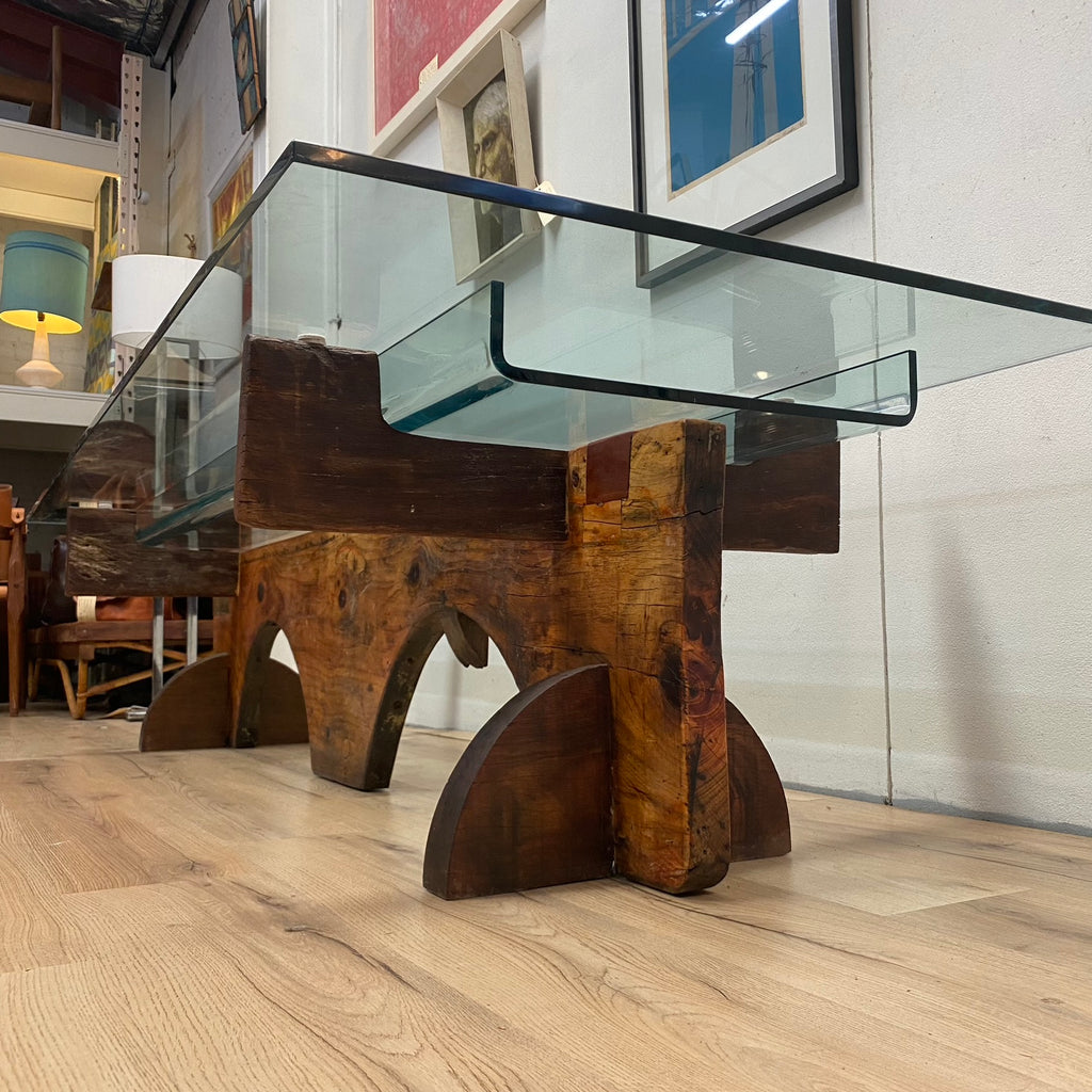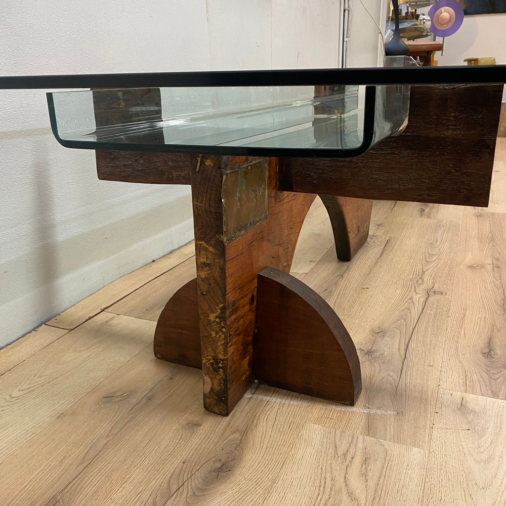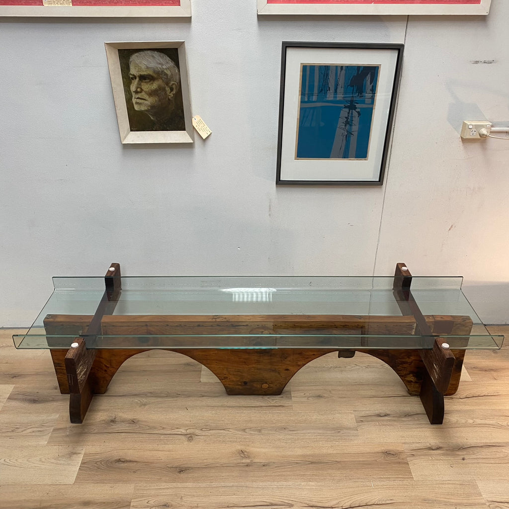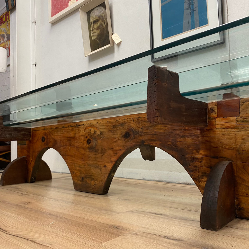 Large bespoke glass top coffee table with heavy sculptural wooden base. This piece has been constructed from several reclaimed materials including a glass table top, mahogany hardwood beams and a handcrafted antique jewellers bench, to create a stunning and unique piece, which would be equally at home in a living room, gallery or corporate foyer.