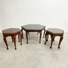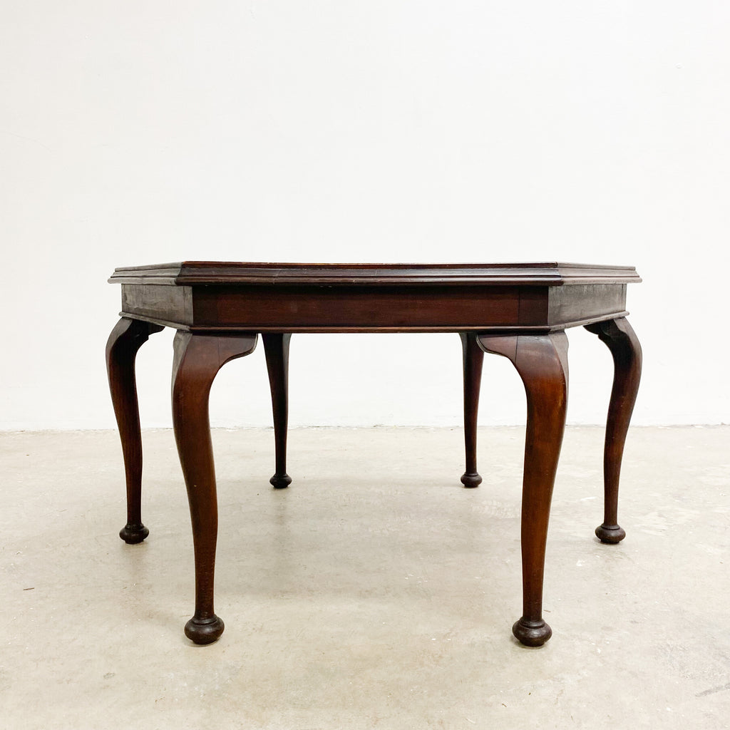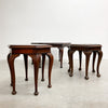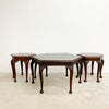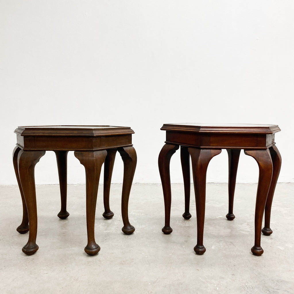 Wonderful and rare art deco set of three hexagonal tables from the iconic Ballarmac house in Coogee. One larger coffee table and two side tables with hexagonal tops and cabriole shaped legs with pad feet. The tops are fitted with recessed glass captured by strips of wood so they will not side around. I think one of the side tables is a slightly different model as the pad feet are larger.