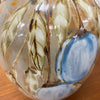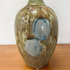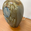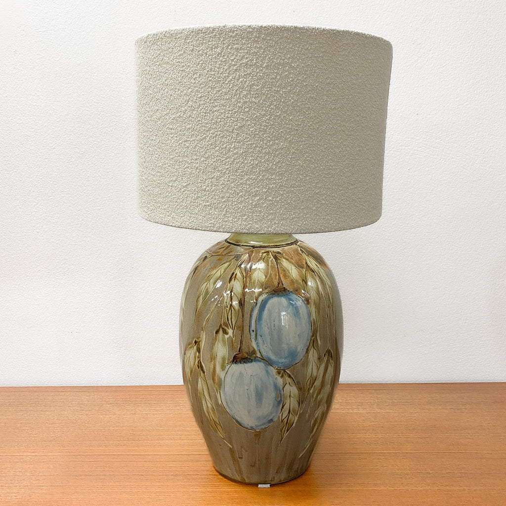 Late 20th Century studio pottery table lamp base by Monique Witt. The glazed surface features a harmonious palette of earthy greens, browns, blues, and detailed depictions of wild plums.