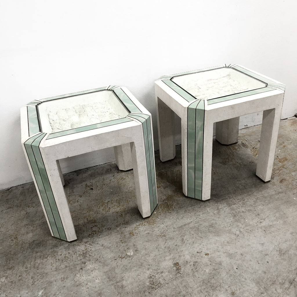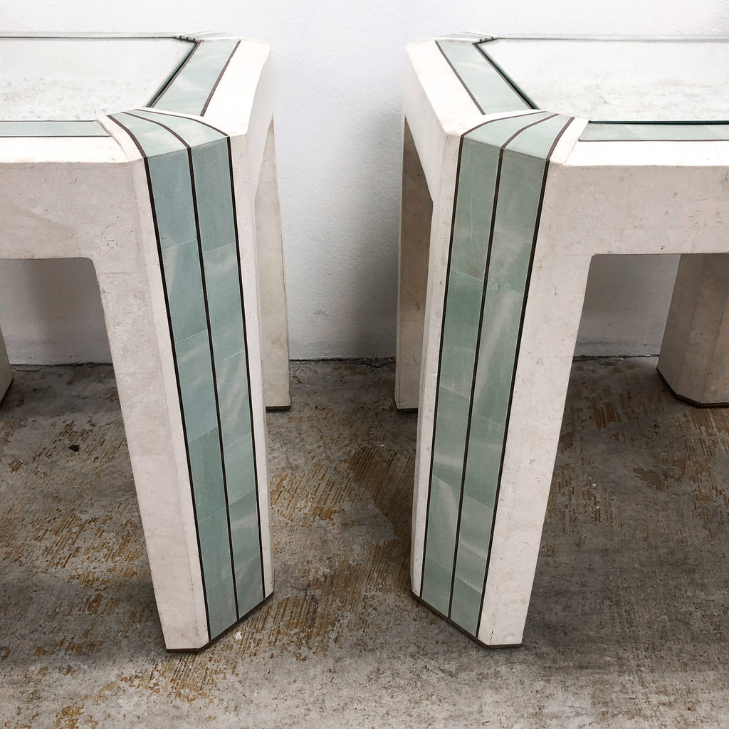 Pair of Tessallated stone clad and brass detail side tables by Maitland Smith. Stunningly unique with gorgeous brass detailing.