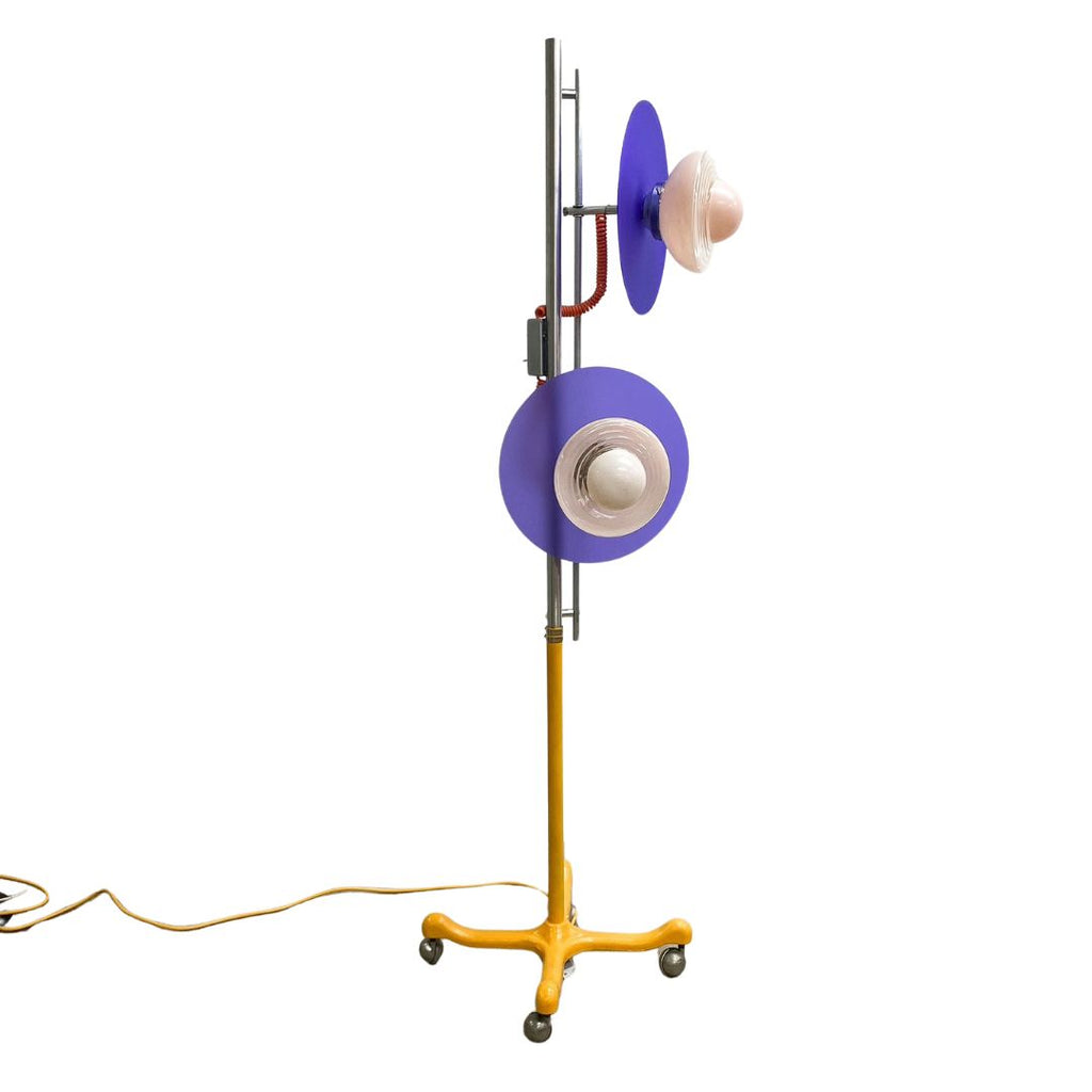 Bespoke floor lamp built using vintage vintage 40s, 50s, 60s and 70s lamp parts with a vintage cast iron industrial mobile base. It has a decidedly 1980s Memphis style to it with a more contemporary feel. Matt Jack the designer and skilled manufacturer has name his creation "The Professor".