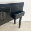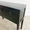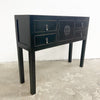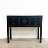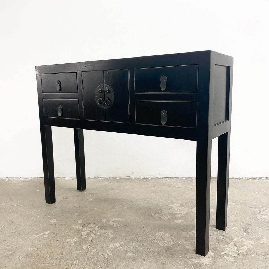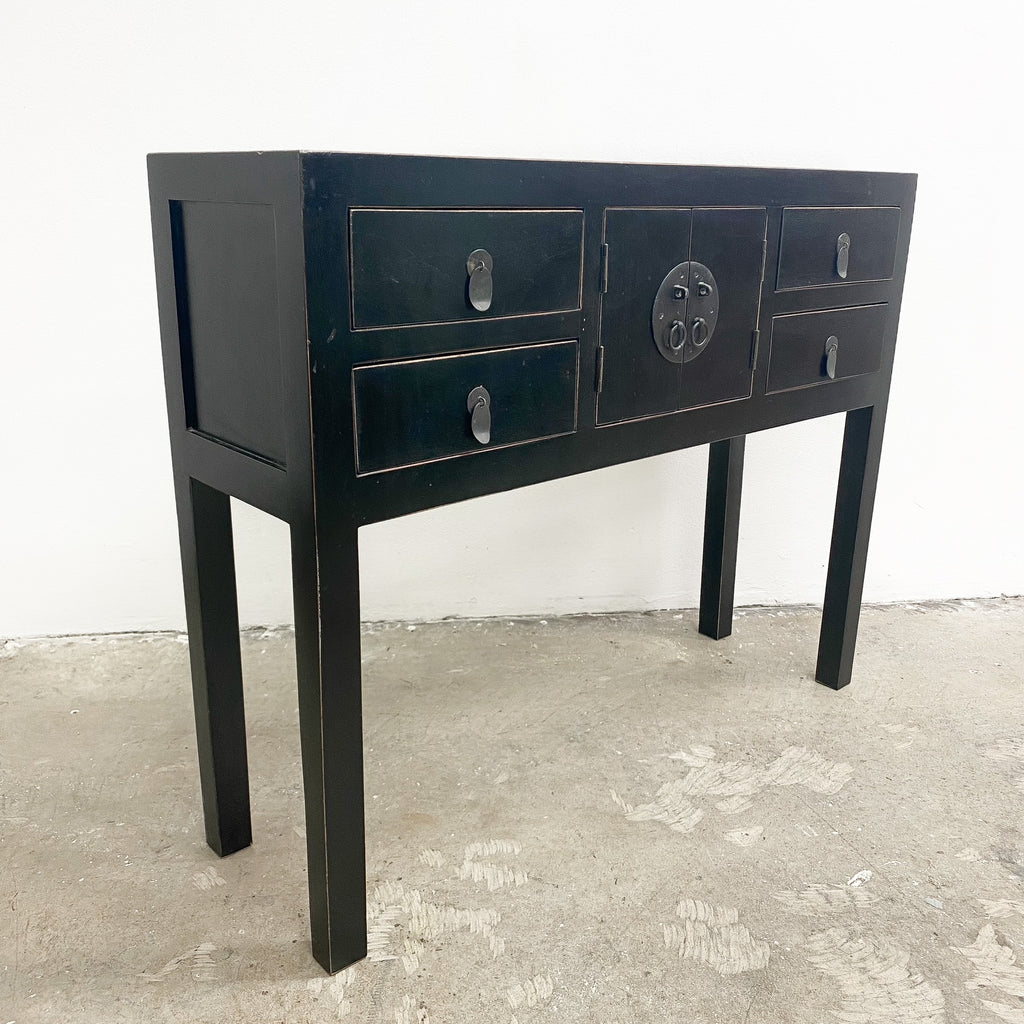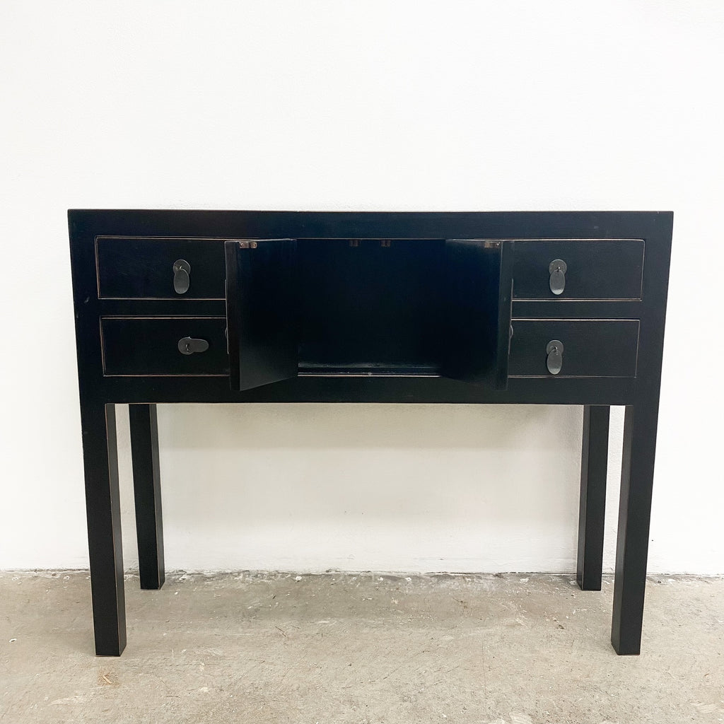 Sleek black Japanese console or hall table. Featuring four drawers and centre storage compartment, all with metal hardware and pulls. Ideal for smaller spaces. In very good used condition.