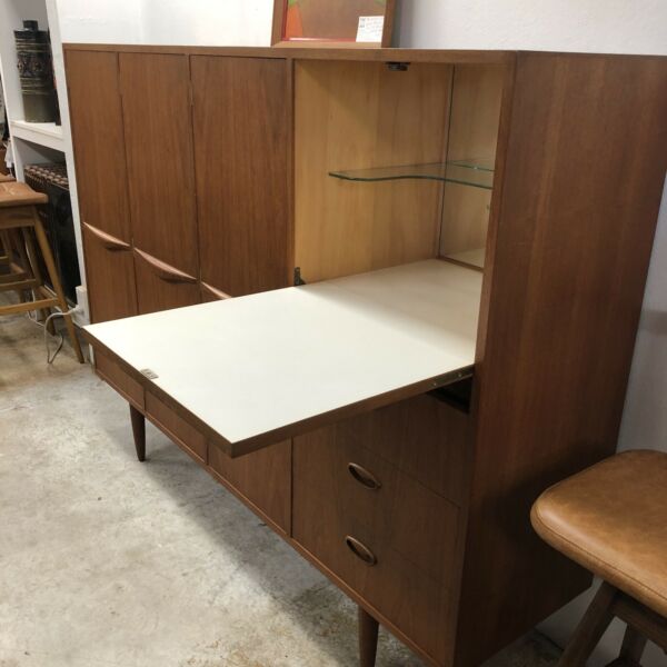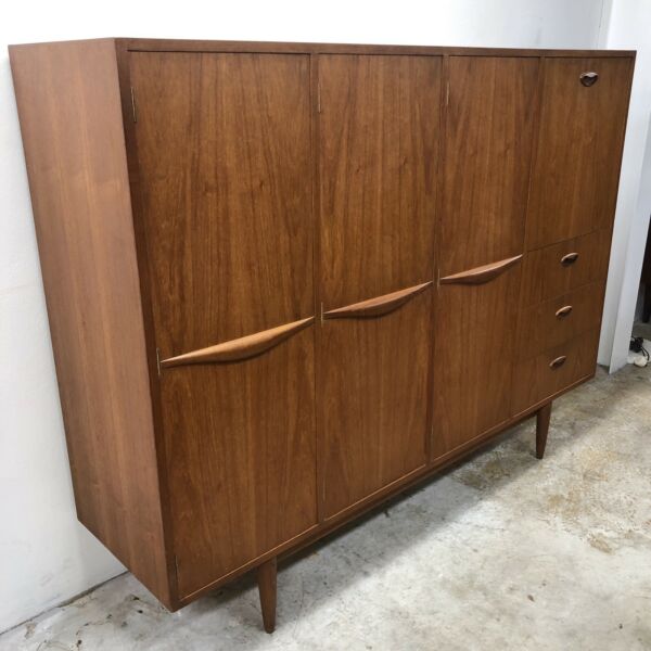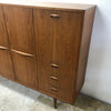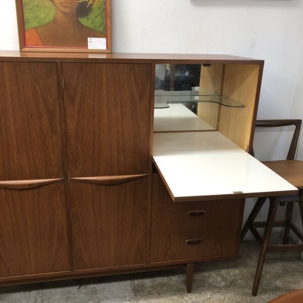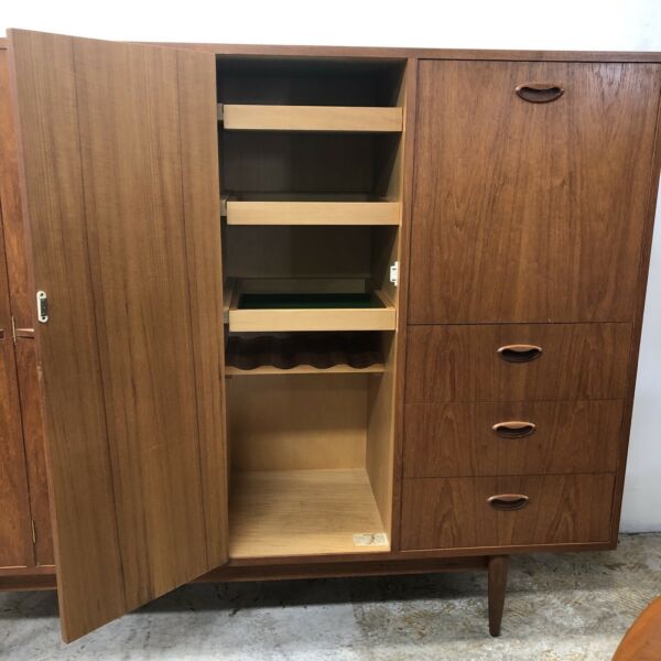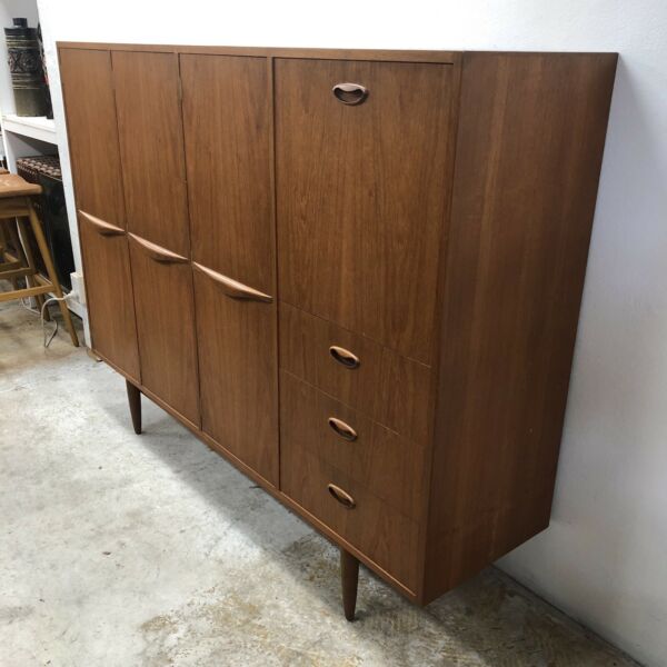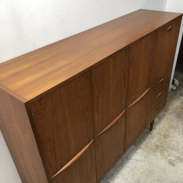Mid century Chiswell cocktail cabinet/bar with solid teak wave handles and beautiful teak grain. The cabinet features 3 cupboard sections, each with shelving and a pull down mirrored bar section with 3 felt lined drawers underneath. This is a very versatile piece and could be used as a bar, storage cabinet or sideboard. In good vintage condition, with some minor signs of use commensurate with age.