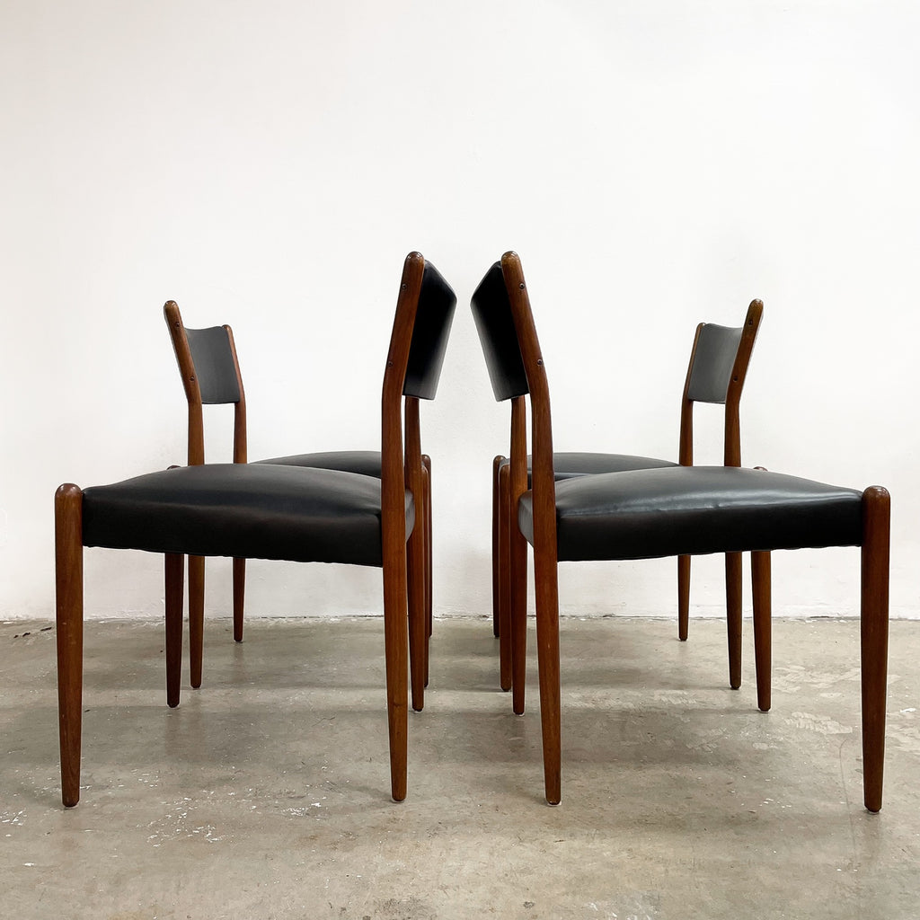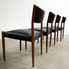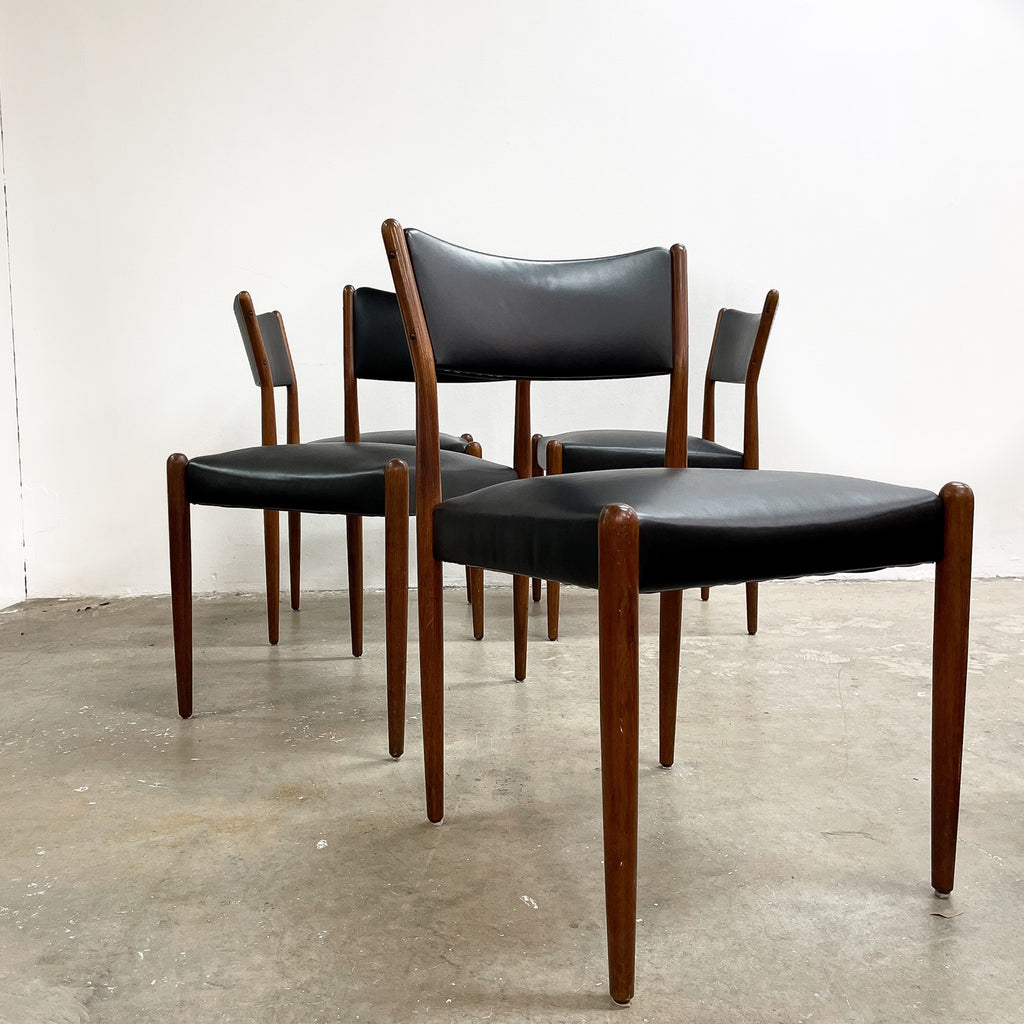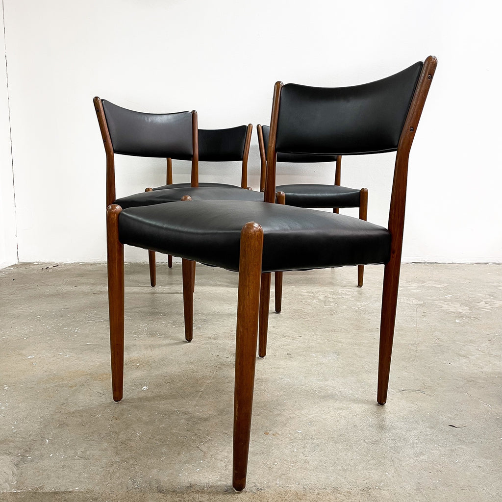 Set of 4 mid century modern Parker dining chairs. Featuring teak frames and newly reupholstered in high quality Italian black leather. Stylish, comfortable and in great condition.