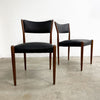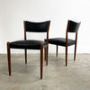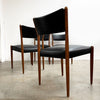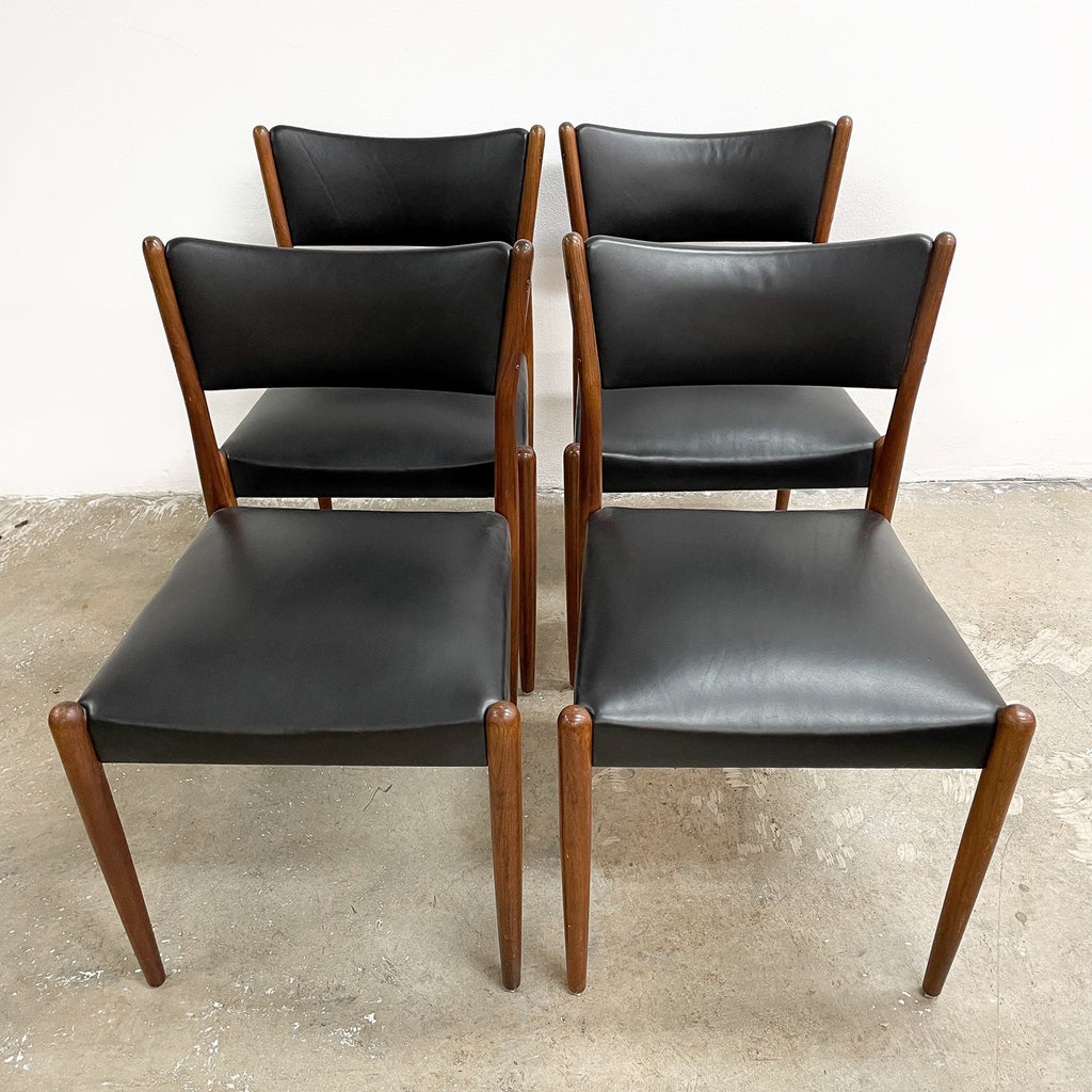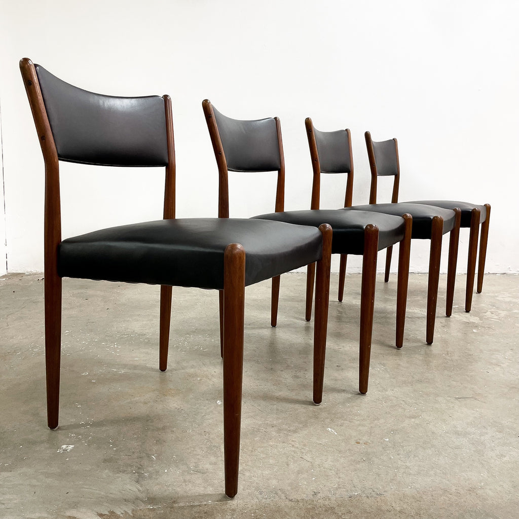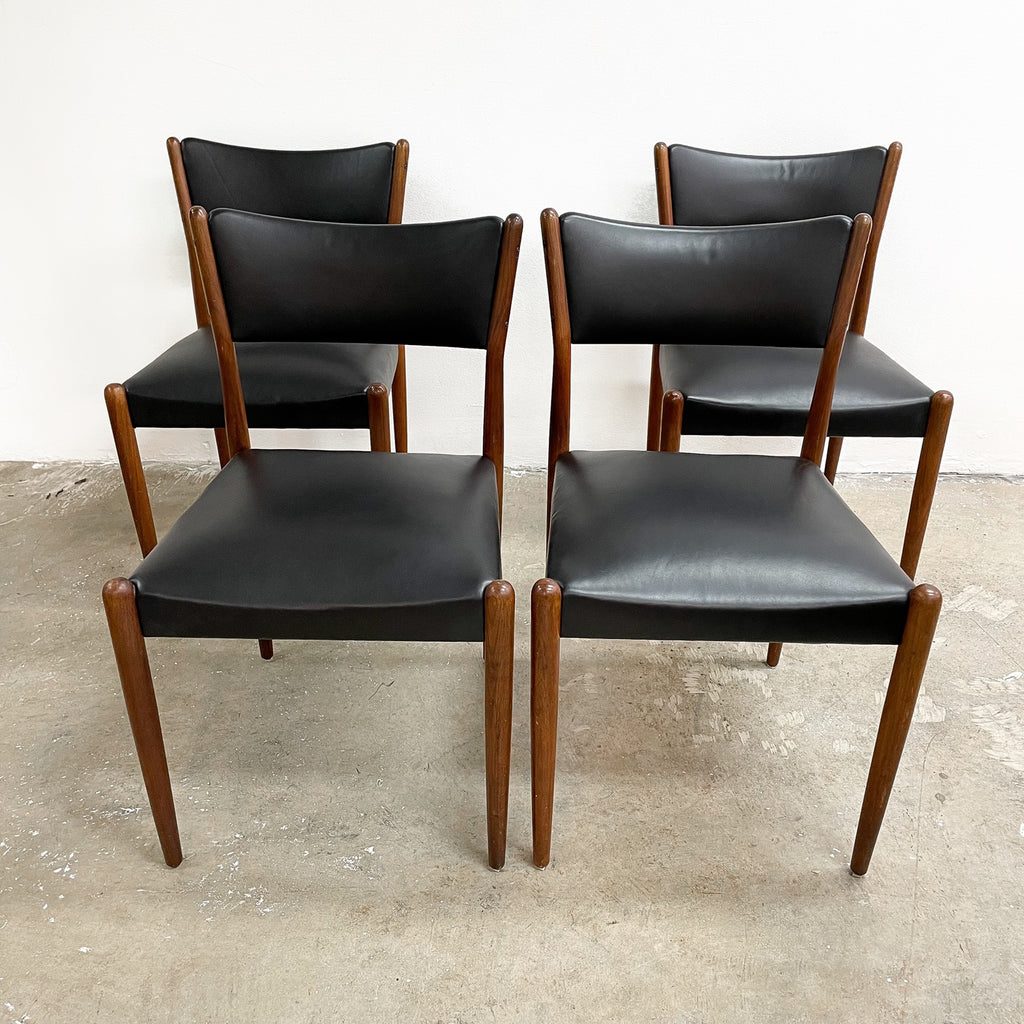 Set of 4 mid century modern Parker dining chairs. Featuring teak frames and newly reupholstered in high quality Italian black leather. Stylish, comfortable and in great condition.